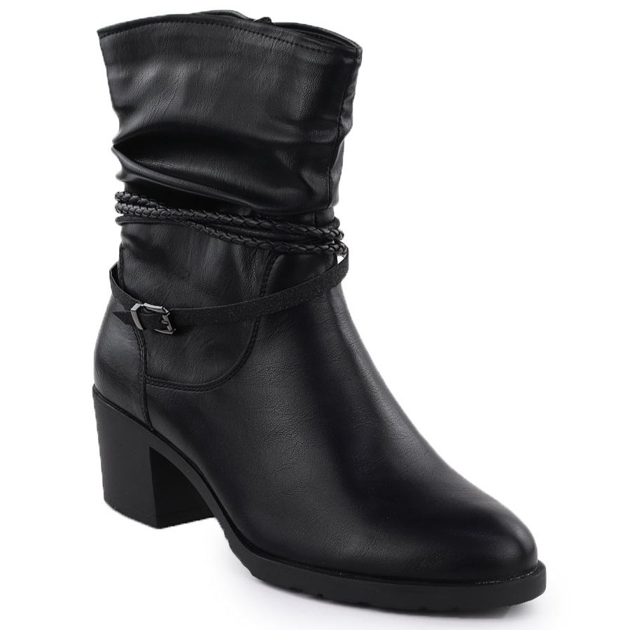 Elegant and comfortable, crinkled boots on the block women's black Jezzi asa128-63 is the perfect choice for every woman who values a fashionable look and comfort. Made of high -quality ecological leather, these boots combine style with practicality, and their upper reaching a height of about 17 cm perfectly wraps the cube, adding elegance to any stylization.