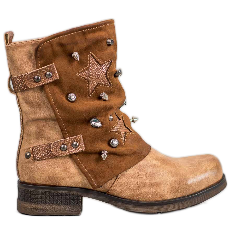We present brown women's work boots from the Super Mode brand, which are a perfect combination of style and comfort. Their decorated uppers reaching above the ankle are definitely eye-catching, and the ecological leather-like material ensures durability and ease of care.