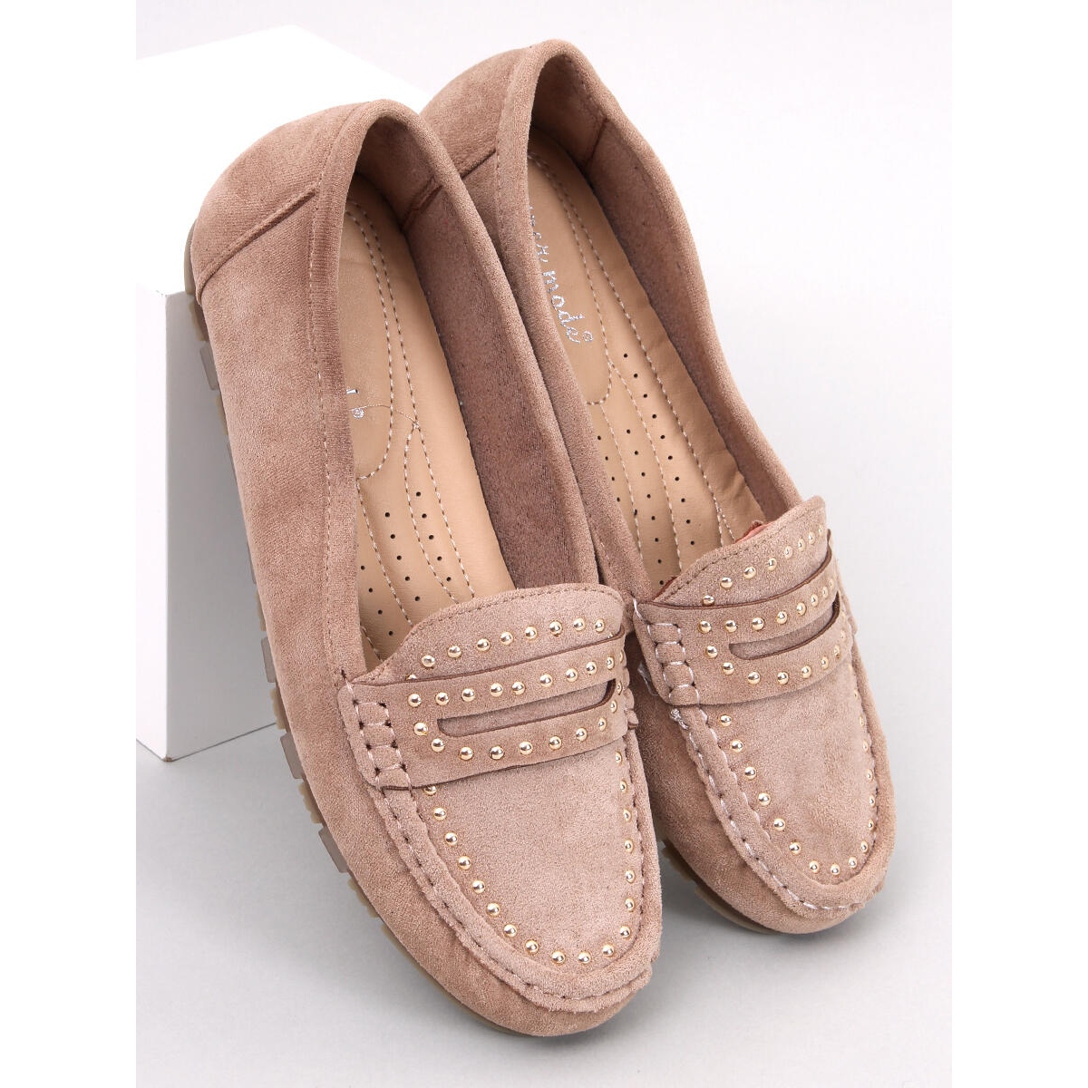 Elegant deys loafers in the Khaki-Beż shade is a combination of comfort and subtle style. The suede upper made of ecological leather decorated with delicate studs and rhinestones creates a unique, timeless pattern that will work in everyday stylizations.