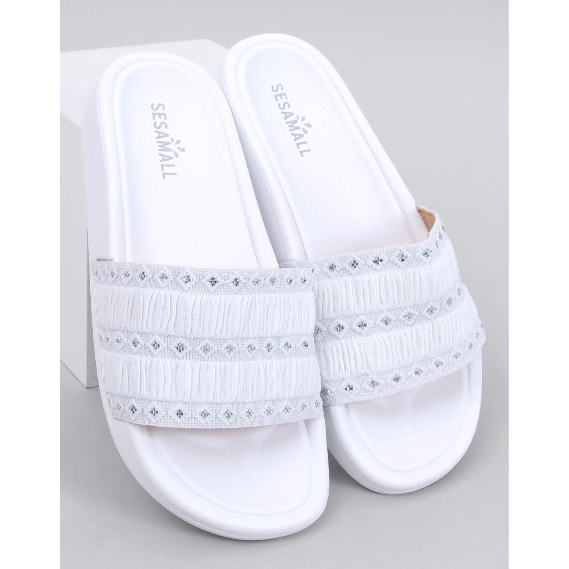 We present the women's flip flops Diakis White - the perfect choice for summer days! These stylish flip -flops combine fashionable design and comfort, which makes them excellent footwear every day. Made of high quality fabric and rubber, they ensure lightness and durability. A wide strap with subtle decorations not only adds elegance, but also provides excellent foot hold.
