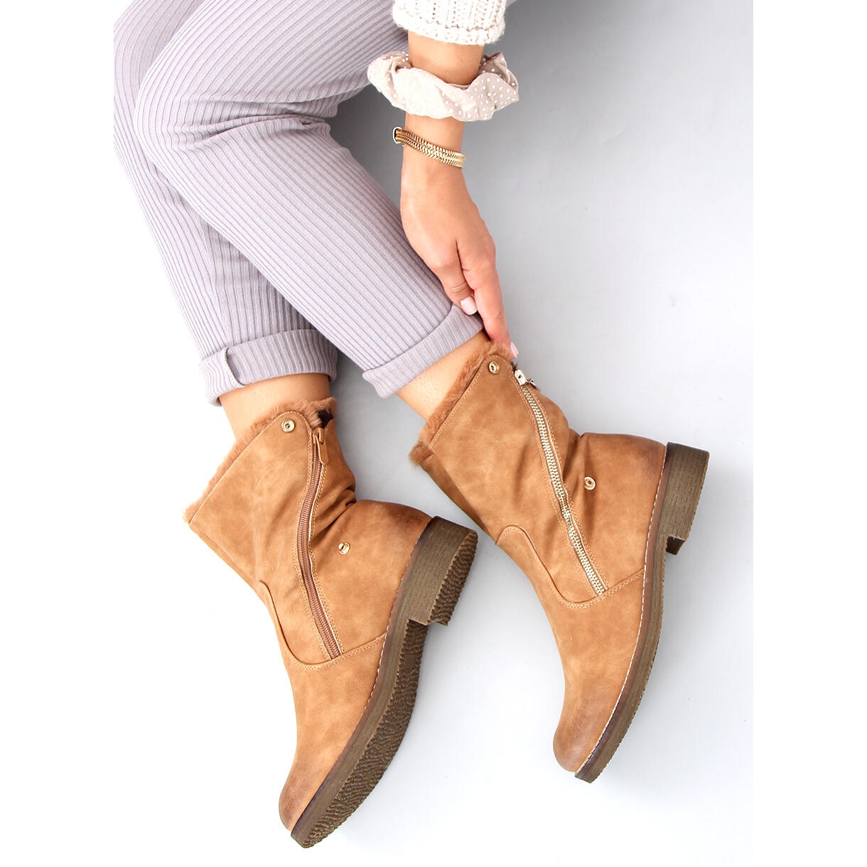 Discover the unique 2 in 1 Double Camel ankle boots in an attractive brown color, which will surely become your favorite piece of clothing. These women's flat ankle boots combine functionality and style, offering two different wearing options. Thanks to the unique upper, you can opt for an elegant, simple look or roll the upper up, exposing the fashionable fur that adds character to them.