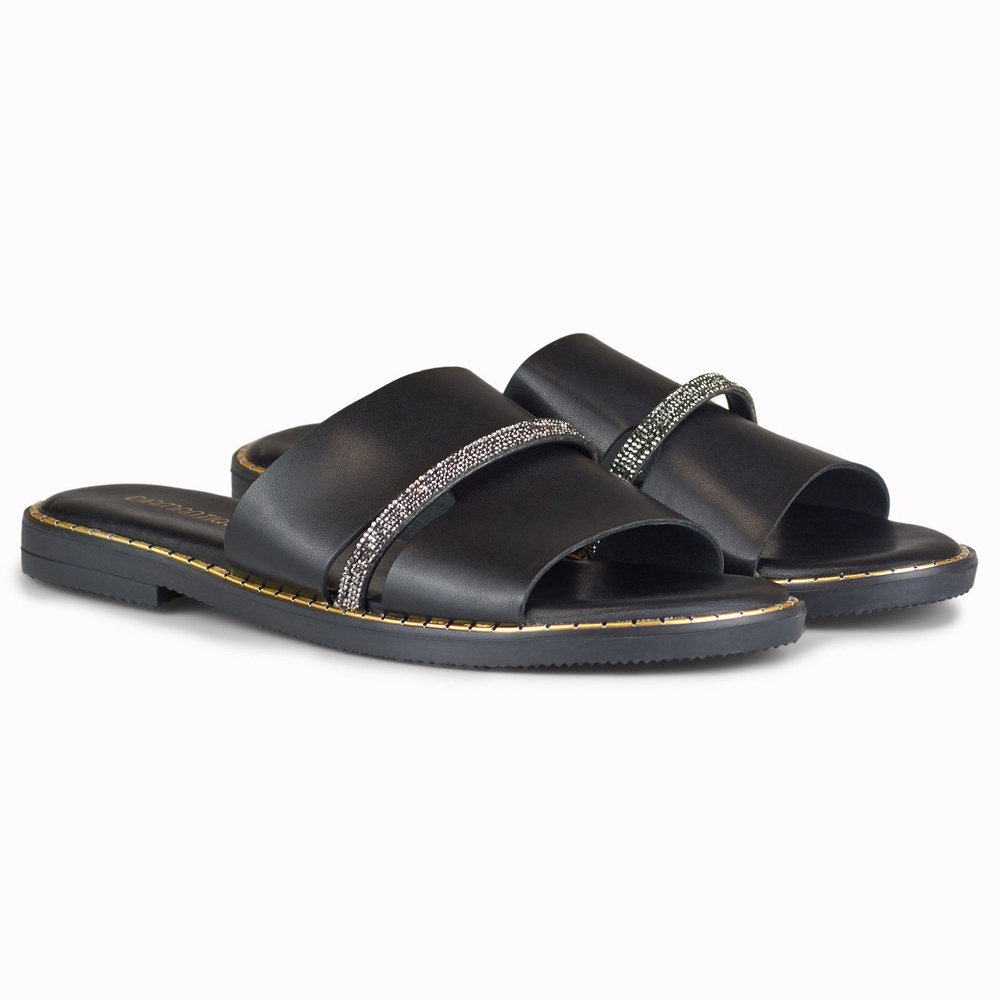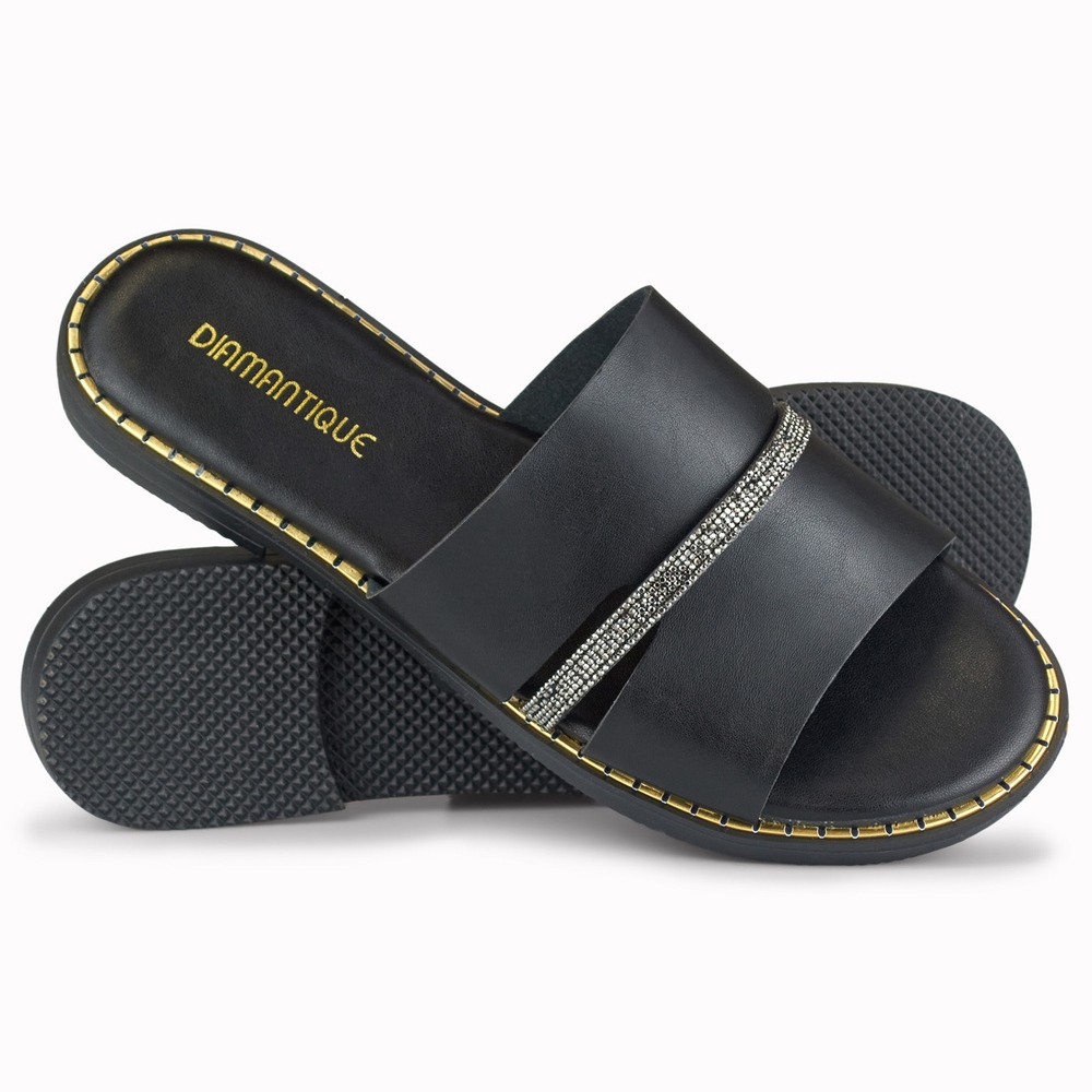 Elegant black flip flops with zircons are a practical and stylish addition to a summer wardrobe - convenience meets subtle elegance here.