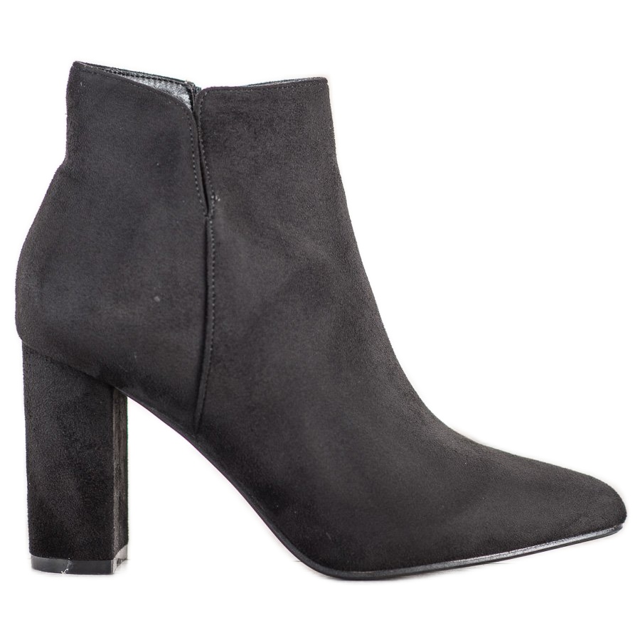 The boots have a classic black color that suits any styling, both casual and elegant. Made of excellent quality imitation suede, they not only look great, but are also easy to maintain. The height of the upper reaching 10-11 cm and the built-in, soft heel counter provide full comfort of wearing, even during a long day. Thanks to the round toe, the feet are not exposed to pressure, which makes these boots an excellent choice for everyday use.
