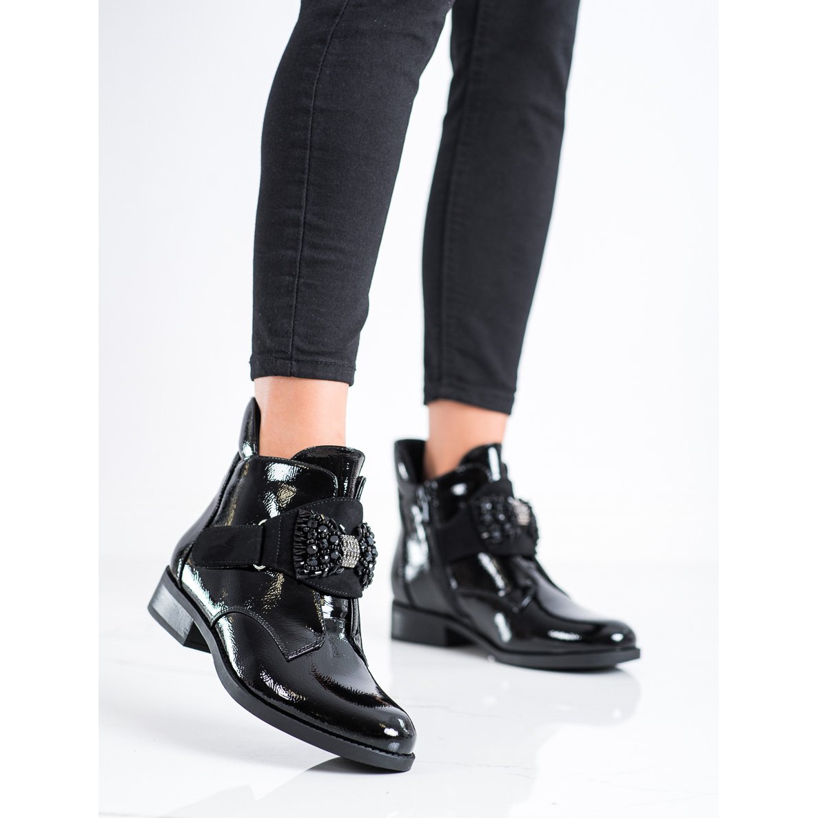 Additional elements, such as a charming bow and rhinestones, give the boots a unique character, and patent details and rhinestones make them unique and eye-catching. The round toe and the height of the upper reaching above the ankle provide comfort and proper support for the foot.