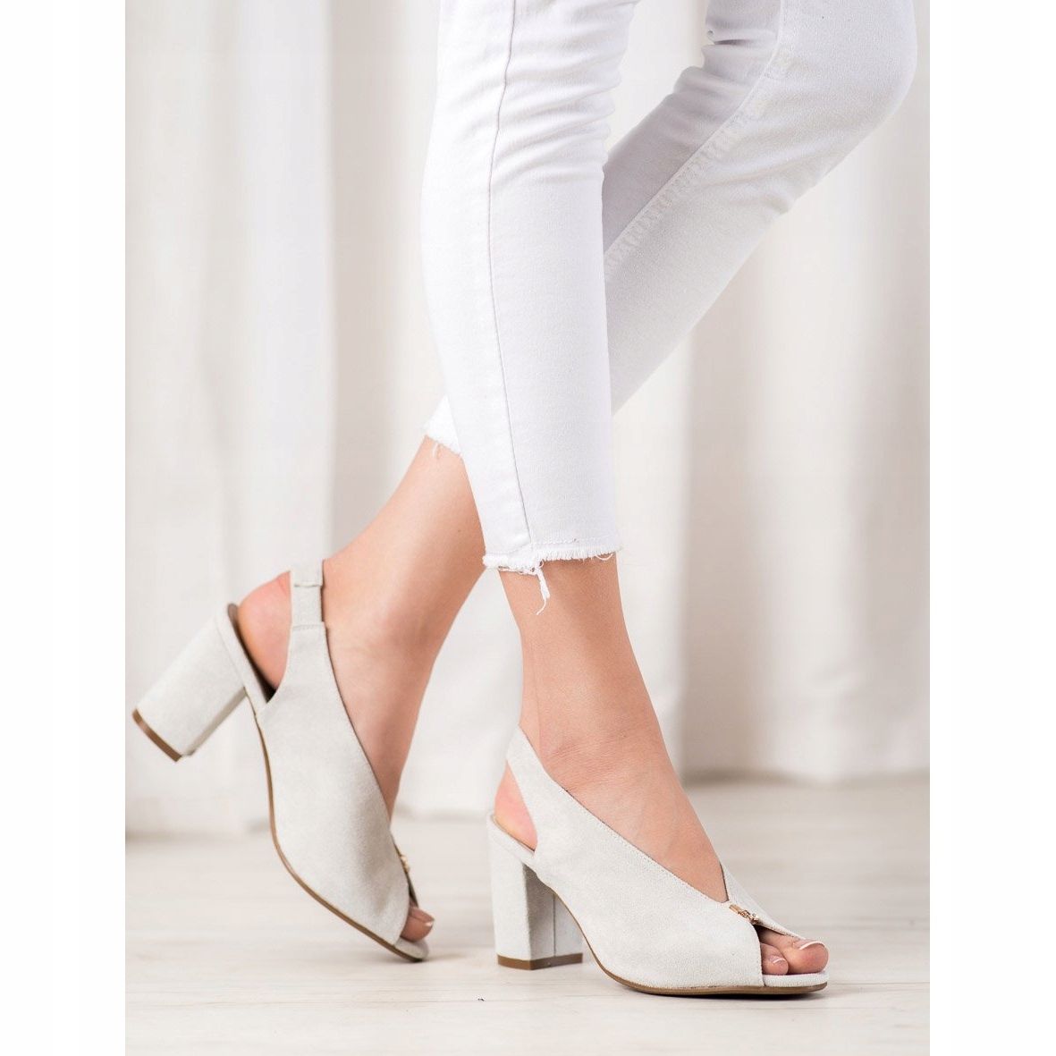 The shoes have a classic design with an open heel and a comfortable 8.5 cm heel, which ensures stability and comfort when worn. Made of ecological suede leather, they are characterized by a smooth synthetic sole, which makes them an ideal choice for spring and summer days. The buckle fastening allows for easy adjustment to the foot, which additionally increases the comfort of use.