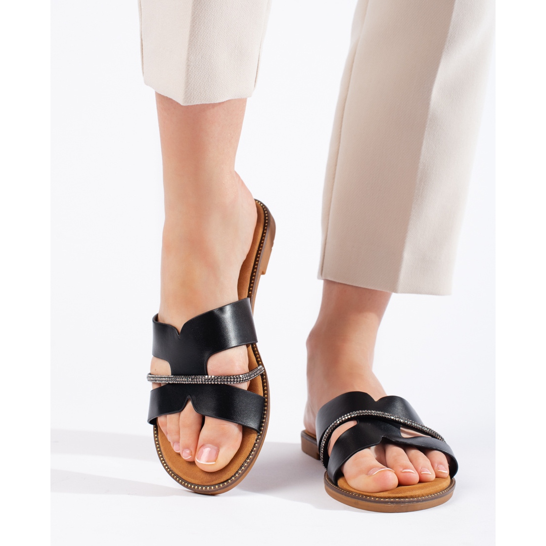 Made of eco-leather, flip-flops combine an elegant look with concern for the environment. The top and inner part of the shoes are high -quality skin imitation, which ensures comfort of wearing all day. An additional advantage is rhinestones that give them a subtle glow and make them even more attractive.