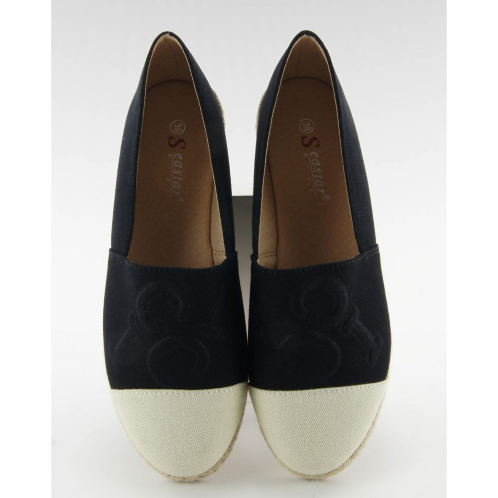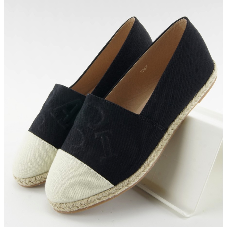 T267 Black espadrilles - stylish, light and comfortable everyday footwear. The classic linen cut is enriched with a contrasting cut toe and a linen string on the sole, which gives the shoes a natural, summer character. There is embossing in the form of convex letters on the front, which adds originality and a subtle premium effect to the model.