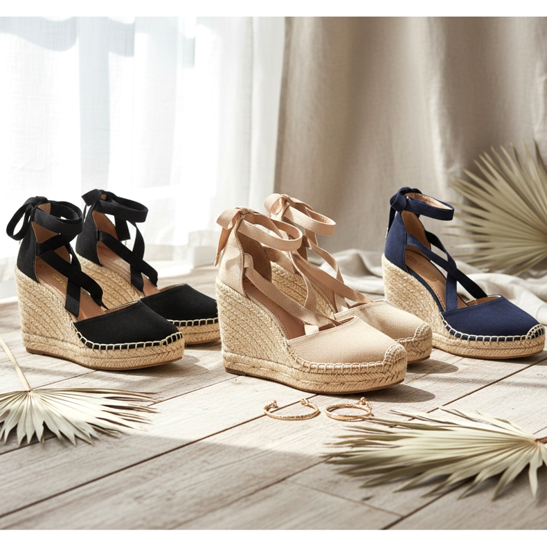 The most universal models are beige, black or navy blue. If you want to optically lengthen your legs, choose beige espadrilles that will blend in with your skin color (or tan). Remember that tying around the ankle may shorten the leg, so short people should be careful with ribbons that are too wide.