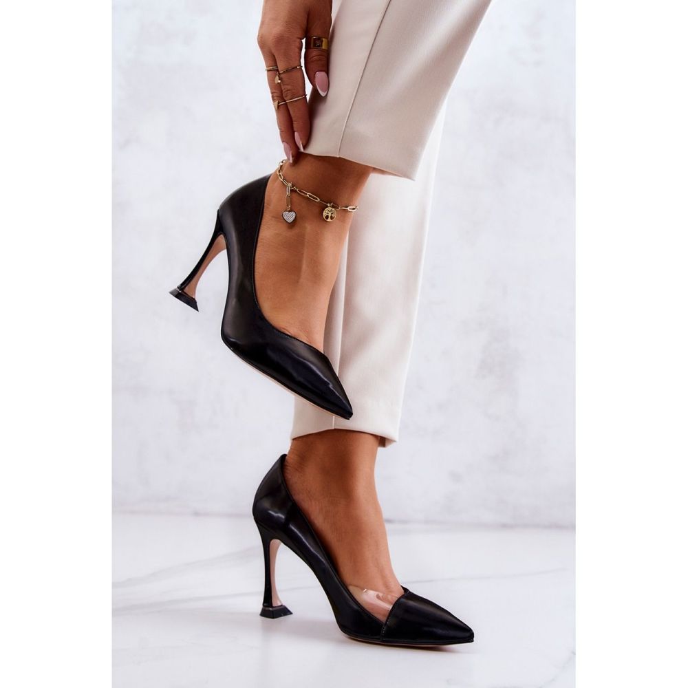 Discover the unique style and elegance with F6102 Black heels! These black pumps on a high heel is a real treat for anyone who wants to stand out in the crowd. Made of high quality eco leather, they look not only fashionable, but also effective. A colorless plastic element, sewn into the upper, gives them a unique character.