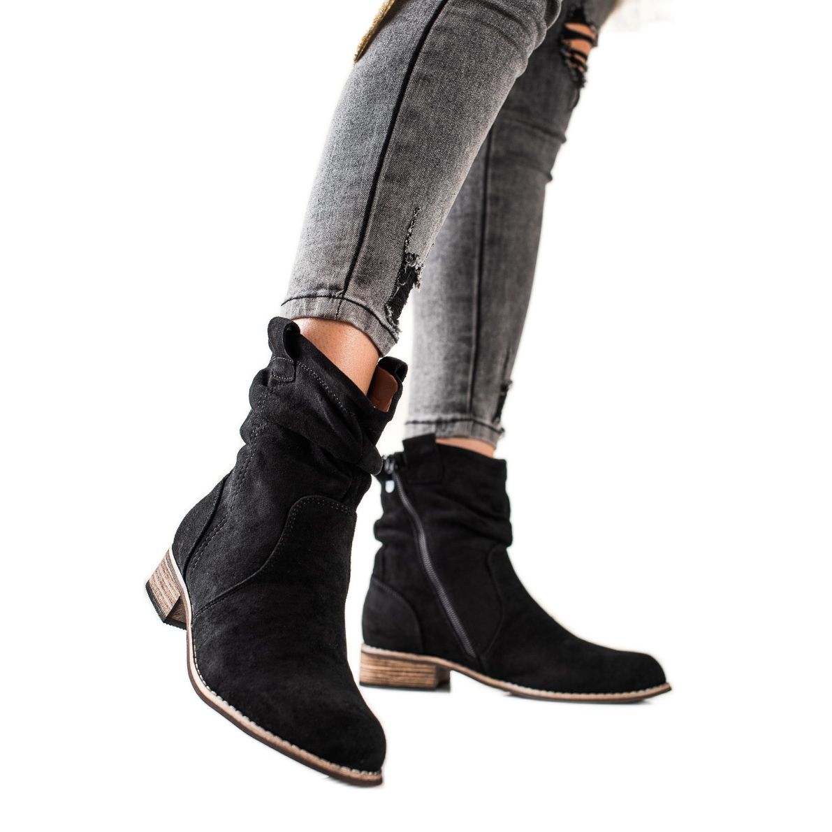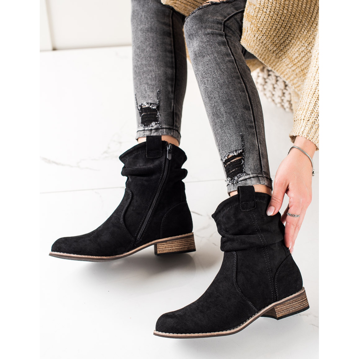 The height of the upper is 15 cm, which means that the shoes reach above the ankle, protecting the feet from the cold. Made of ecological suede leather, they have a round toe, which adds subtlety to them.