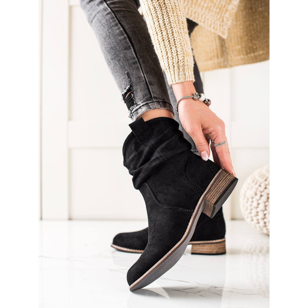 The heel is closed and stiffened, which provides additional support and comfort of wearing. Their sole, made of synthetic material, is smooth, which affects the grip and stability. Cowboy boots have a flat heel with a height of 3.5 cm, making them ideal for long walks.