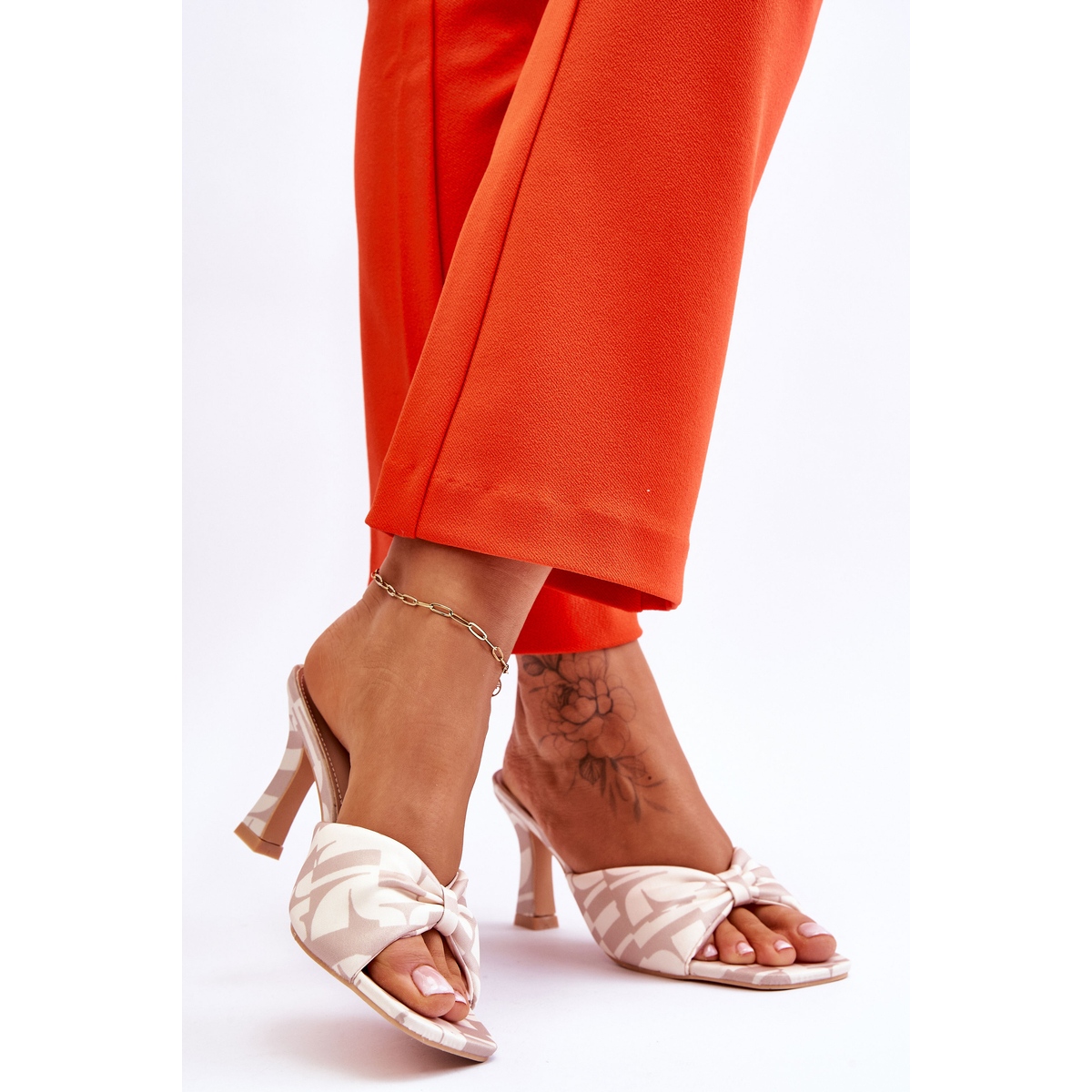We present the fashionable Floria heeled flip-flops in an elegant beige color, which will certainly attract the attention of every fashion lover. Made of high-quality textile material, these flip-flops are characterized by an interesting print and a charming, soft bow placed at the front, which gives them a unique charm.