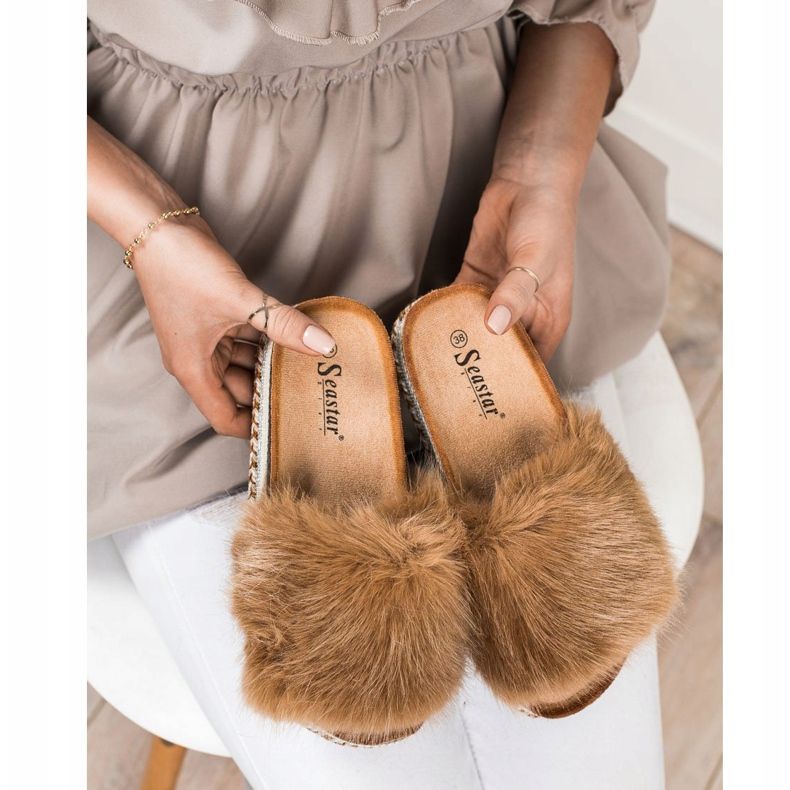 Discover exceptional comfort and style with brown sandals on a decorative platform from Seastar! These fashionable, slip-on sandals made of high-quality fabric attract attention thanks to the upper covered with luxurious faux fur in a natural shade.