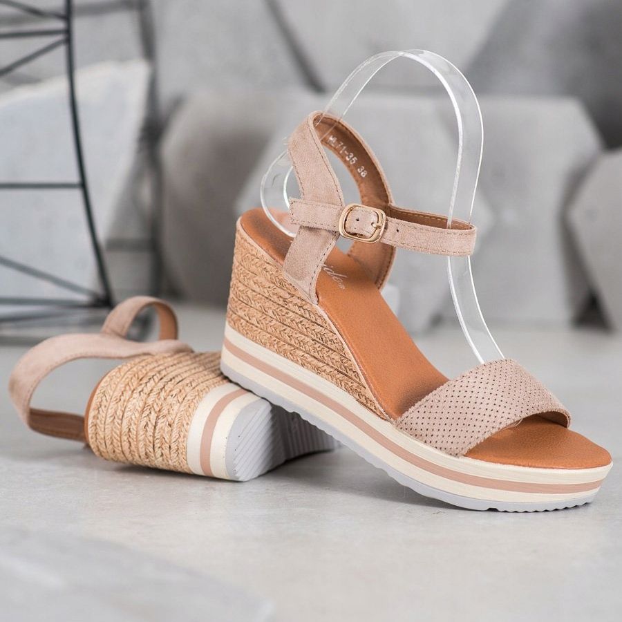 Discover elegance and comfort with the fashionable Weide wedges made of ecological leather with a suede finish. These beige sandals perfectly fit into the latest trends and will be the perfect complement to many spring-summer styles. Thanks to the adjustable buckle fastening, you can easily adjust them to your needs, and the 8.5-cm wedges decorated with a braided string provide not only a fashionable look, but also stability and comfort of wearing.
