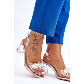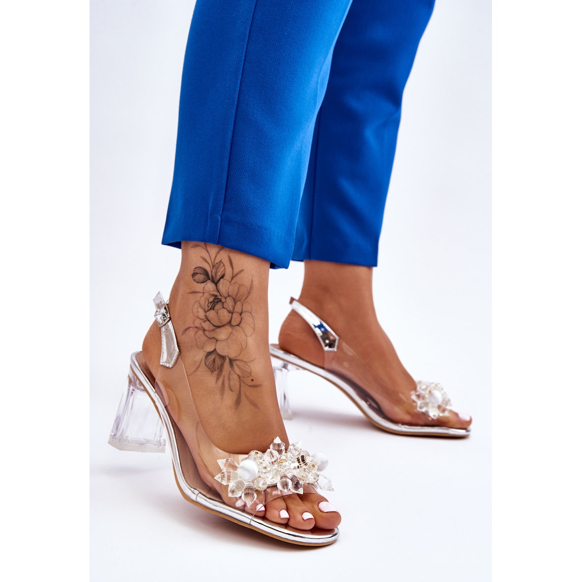 Stylish women's sandals combining a subtle transparent upper with shiny decorations - perfect for the spring/summer season. The Carmelo model is embedded on a stable, 7 cm post, which optically slims the figure, while providing comfort for wearing all day. The front part is decorated with beads, zircons and rhinestones that add elegant glow.
