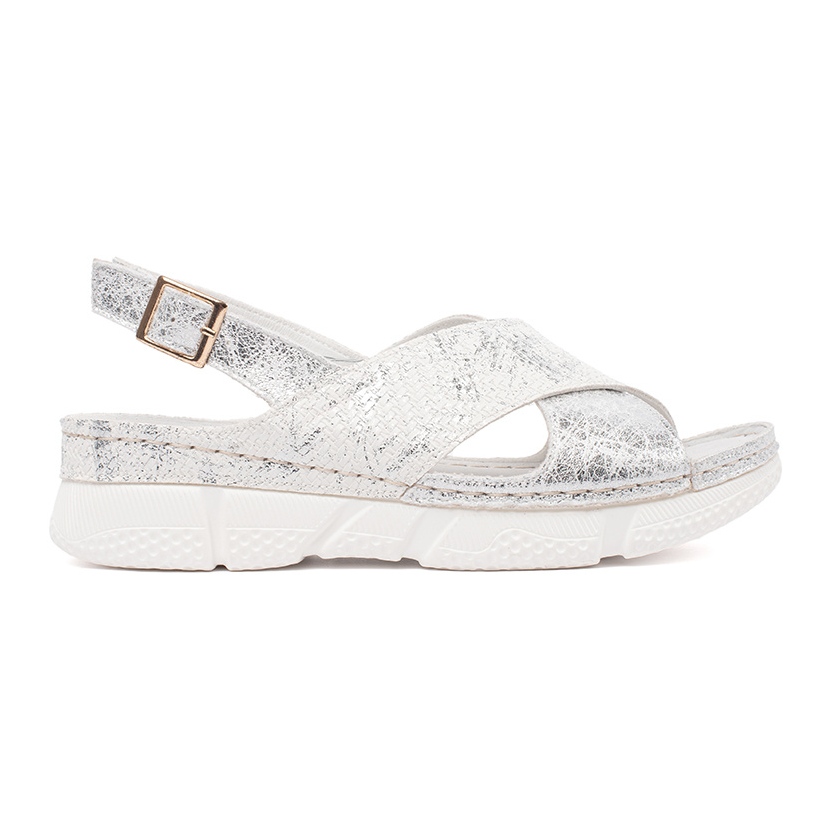 External material is ecological leather, which not only looks attractive, but is also easy to care for. The interior of the sandals is filled with a comfortable natural leather insert, which ensures a perfect fit and wearing comfort. The buckle fastening allows quick and easy putting on, and the classic white color makes these sandals a stylish complement to any stylization.