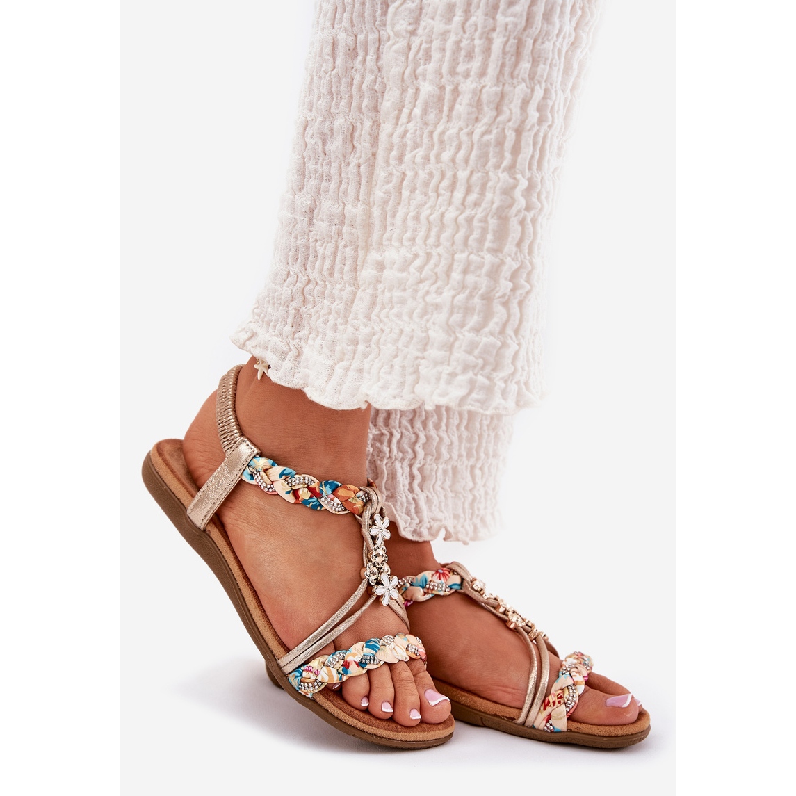 Discover the lightness and style with women's sandals Artiker 54C1323 in golden color, which will be perfect for warm days. These unique sandals made of high -quality textile material attract eyes with braided stripes and subtle pins and zircons, which give them an elegant and fashionable character.