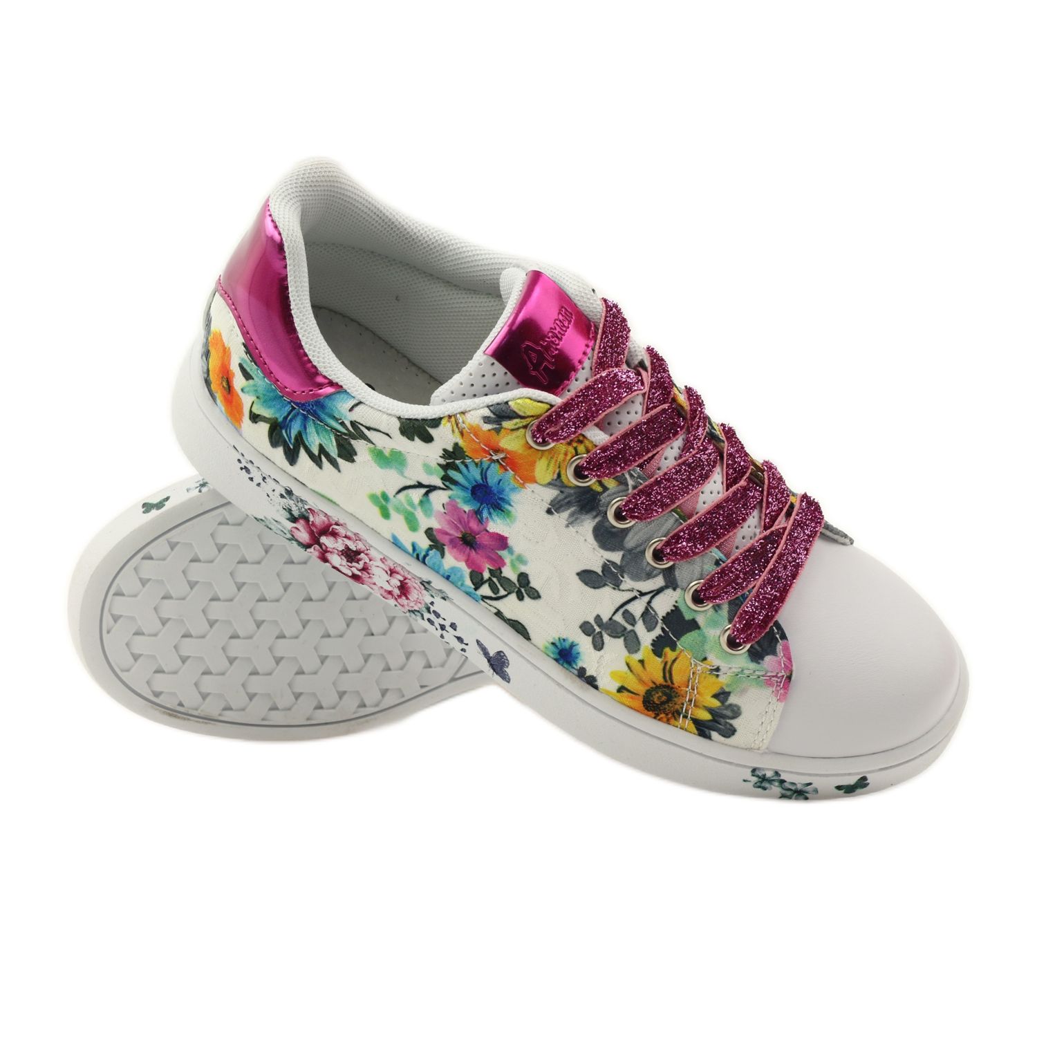 The sneakers stand out with their original style thanks to the delicate glitter lace that slides through silver eyelets. This innovative solution makes the footwear not only practical, but also a fashionable accent to any styling. On a slightly thicker, white, rubber sole, the sneakers offer flexibility and adequate cushioning, making them ideal companions for everyday adventures of young users.
