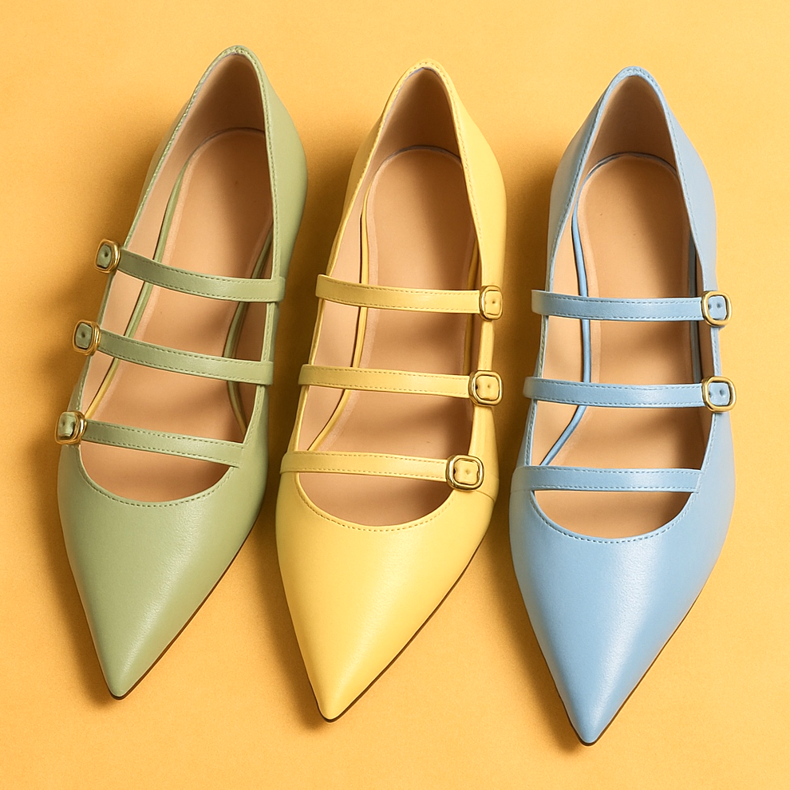 Ballerinas do not leave the pedestal, but in 2026 they change their appearance. The most fashionable models will be those with a sharp, pointed toe, which optically lengthens the legs. We are also seeing a great comeback of stripes - Mary Jane-style ballet flats, with two or even three stripes on the instep, are an absolute must-have. Colors? Sweet pastels: pistachio, baby blue and butter yellow.