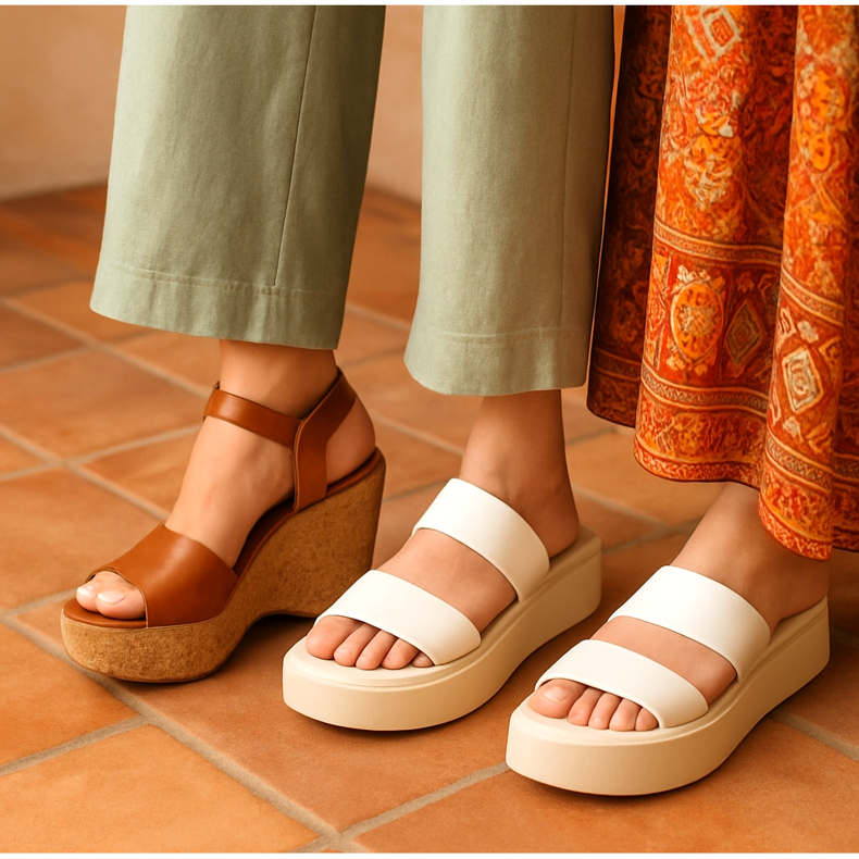 If you love heels, we have good news: comfortable wedges and platforms are back, but in a lighter version. Sandals with a cork sole in the style of the 1970s and flat-form flip-flops will dominate urban styling. They are stable, add centimeters and fit perfectly with fashionable wide palazzo pants and boho-style maxi dresses.