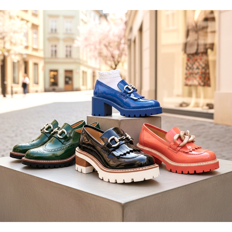 Loafers maintain a strong position in the footwear trends of 2026. This season, models with a slightly more avant-garde character dominate - loafers with a thick, contrasting sole, models with cuffs and decorations at the toe, as well as patent variants in bold colors, such as cornflower blue, bottle green or coral.