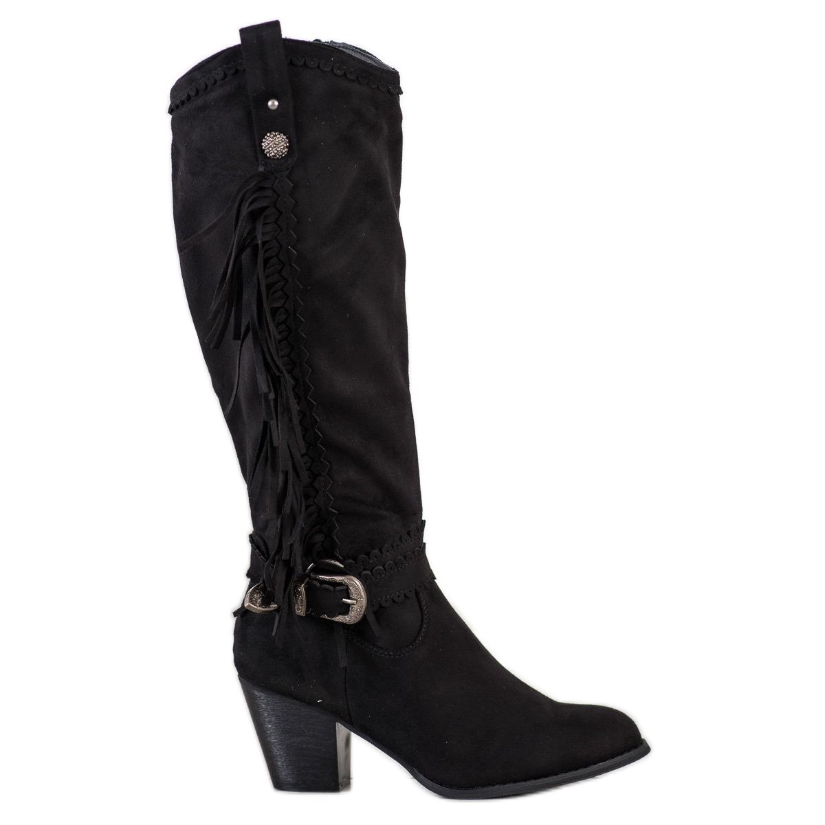 We present the Fringed Cowboy Boots from the renowned manufacturer Diamantique. These stylish women's shoes are the perfect choice for women who value fashion and comfort. Made of ecological suede leather, they look phenomenal, and their black color makes them easy to match to various styles.