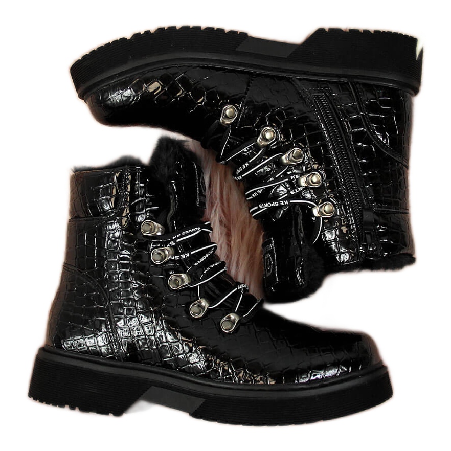 Girls' ankle boots patent crocodile black Miss❤E are a must-have in every fashionable girl's wardrobe! These incredibly stylish shoes combine comfort and stunning design. Made of high-quality ecological patent leather, they look elegant and impressive, perfectly fitting into the latest trends.
