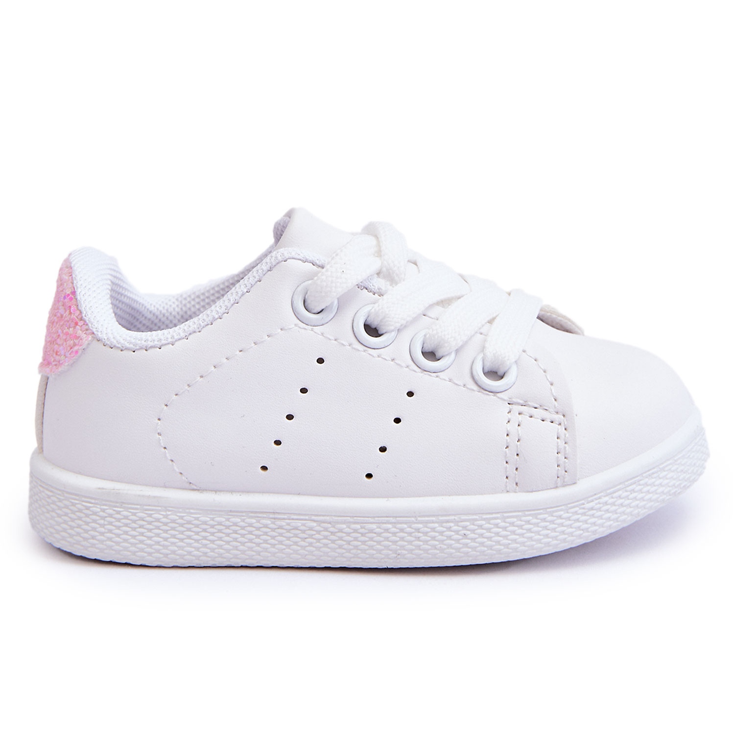 Children's Sports Shoes White and Pink Glossy are unique sneakers for girls in white with pink accents. These shoes feature an eye-catching, sparkling glitter embellishment, which makes them not only functional, but also fashionable and stylish. The lace closure allows you to precisely adjust the shoes to the foot, ensuring full comfort while wearing.