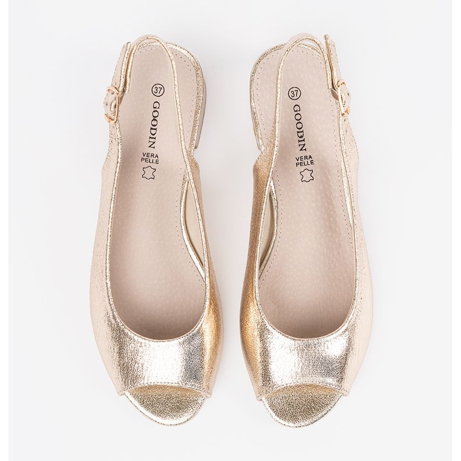 We present unique low -heeled sandals in an elegant golden color from the Goodin brand. This is a great choice for every woman who wants to combine comfort with elegance. This model is characterized by an open heel and ecological skin, which makes it not only fashionable, but also a friendly environment.