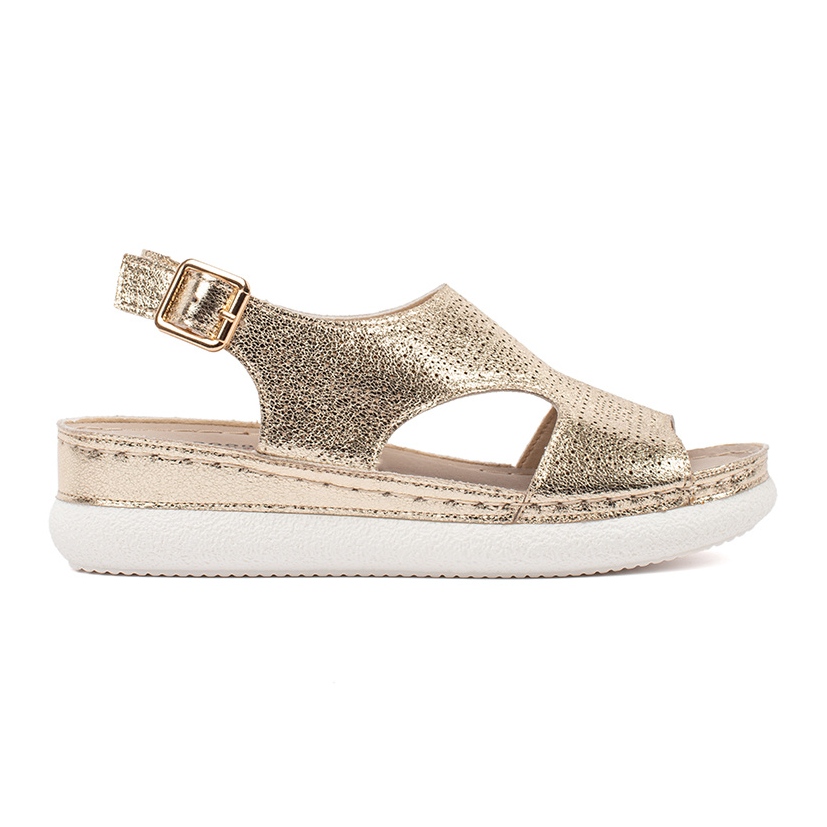 We present elegant golden sandals on a light platform from the renowned Goodin brand, which are an excellent choice for women who want to feel themselves and exceptionally in the summer months. These sandals are distinguished by an open heel and a nose, which is ideal for hot days, while ensuring adequate ventilation.