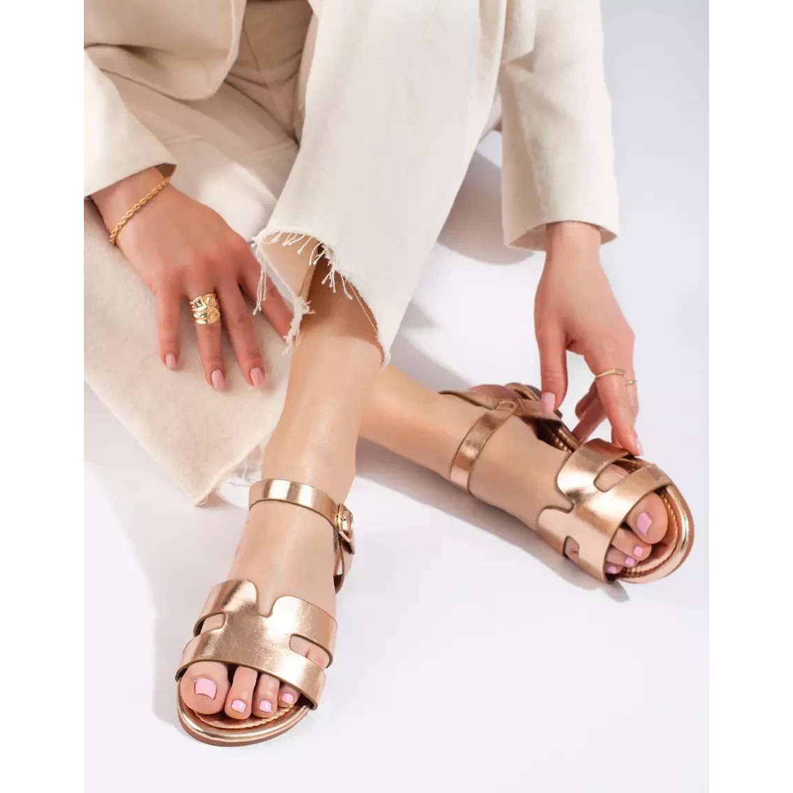 Elegant and universal Shelovet sandals in golden color are the perfect proposition for spring and summer days. A classic cut with a metallic finish will add splendor to everyday stylizations, and a flat, slightly elevated sole will provide comfort throughout the day.