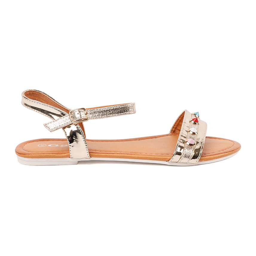 Discover a unique style and comfort thanks to gold flat sandals with colorful studs! These elegant shoes are a perfect complement to every summer stylization, perfectly combining slack with modern design. Regardless of whether you are going to meet friends or for an evening out, these sandals will be a great choice.