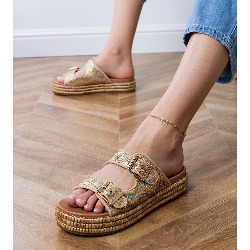 Golden flip flops with stripes are a must-have for the upcoming season! Created for women who want to combine elegance with daily comfort, these classic flip flops will add splendor to any stylization. Their shiny, golden color stands out from other models, which makes them an ideal choice for summer walks, meetings with friends or relaxing in the garden.