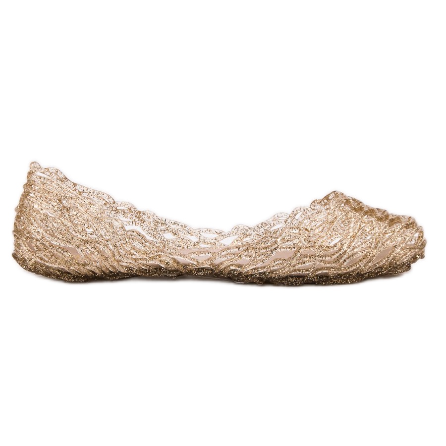 Golden Meliski Vinceza are the perfect choice for summer days, combining elegance and comfort. Made of high-quality rubber, these ballerinas perfectly fit the foot, providing extraordinary comfort throughout the day. The insole made of ecological leather adds subtlety, the openwork pattern and beautiful golden color attract attention and make every styling unique.