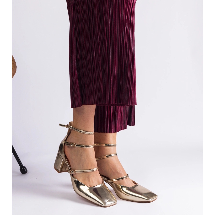 Golden pumps varnished on a post with buckles are a dream choice for women who want to add a little shine and elegance to their look. The G10059 model, created by a valued manufacturer, combines modern design with high quality. The metallic golden color catches the eye and fits perfectly with various stylizations - from office to evening.