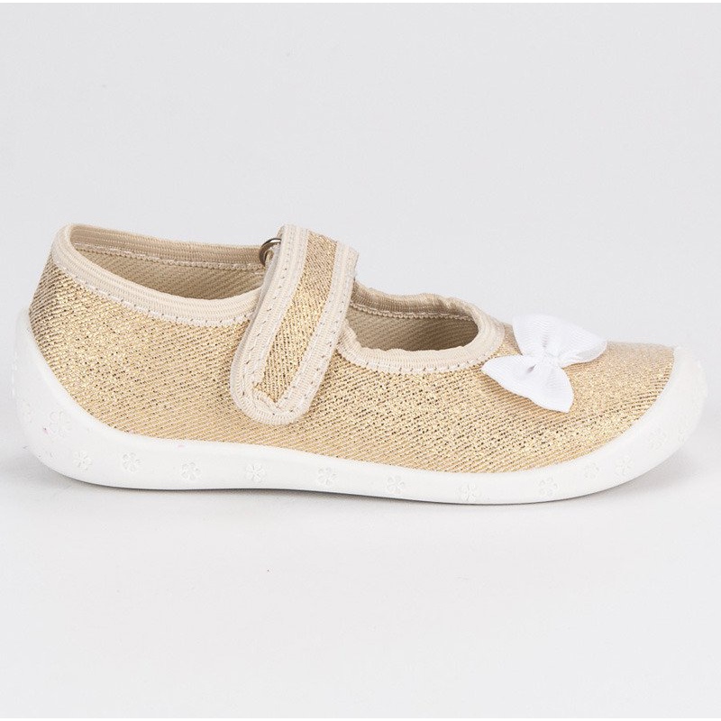 Delicate, girlish slippers in golden-yellow tones, decorated with subtle white bows. Fastened with a practical Velcro - you can quickly and comfortably adjust them to your child yourself. A rubber sole with a non-slip tread and a high heel ensures stability during play and in school corridors. Insoles made of leather, profiled for better foot support and comfort throughout the day.