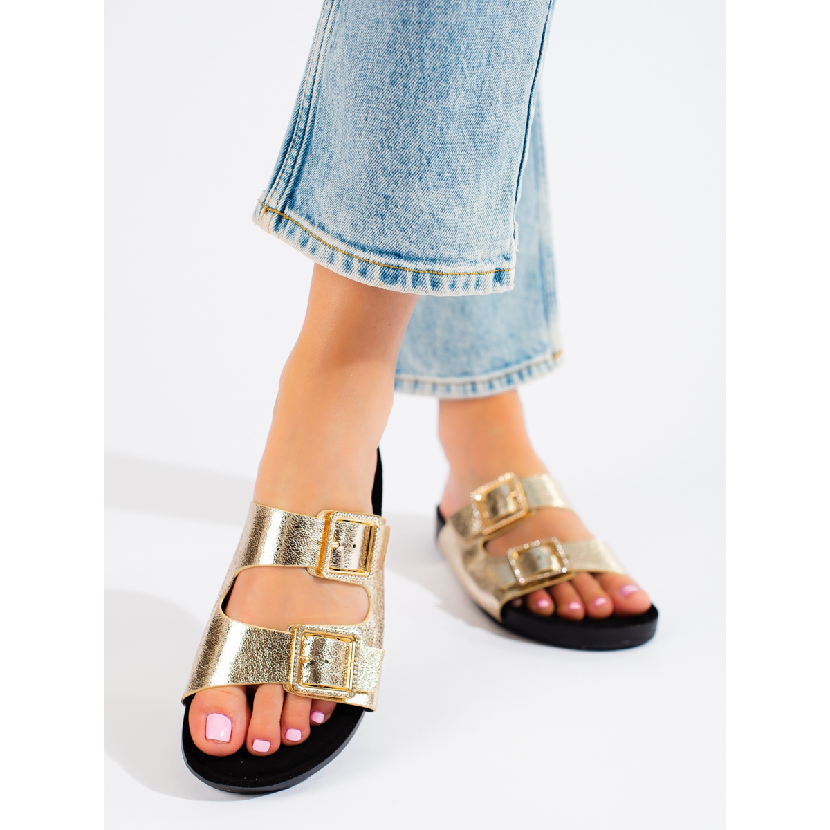 Discover the elegance and comfort of wearing offered by the gold Goodin mules with decorative buckles. These stylish women's shoes, perfect for everyday wear, combine classic design with modern accents, making them perfect for spring and summer styling.
