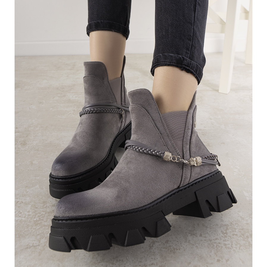 Fearless gray ankle boots with a bracelet are a must-have in every woman's wardrobe, combining elegance with modern style. Made of high-quality suede eco-leather, they stand out with a unique design with a worn-out effect on the toe, which adds character and uniqueness.