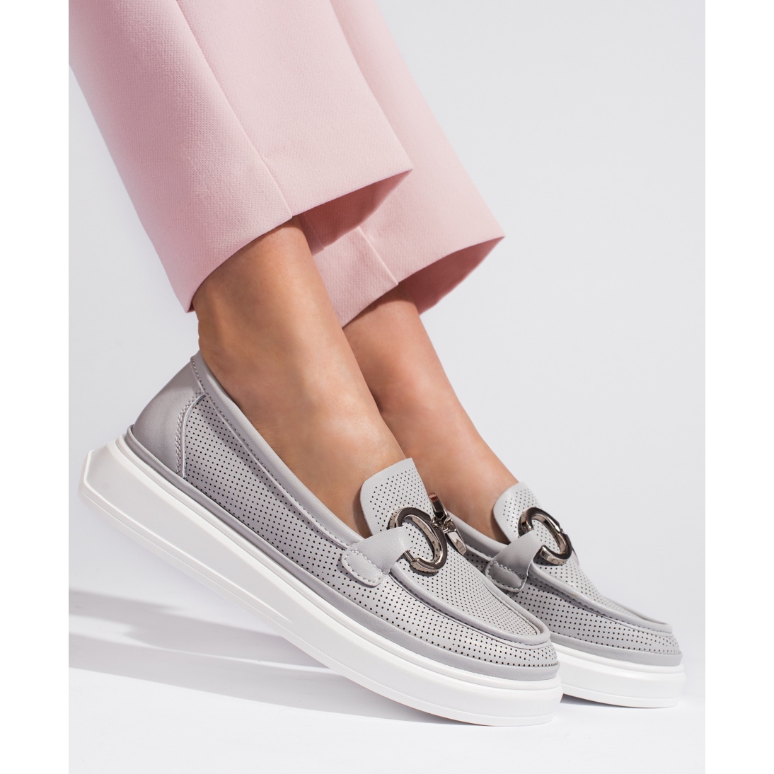 Moccasins have a 3 cm high platform, which makes them comfortable and easy to wear all day. Gray with delicate silver accents means that they match many styles. The original packaging of the manufacturer adds elegance, making it a great choice for a gift.