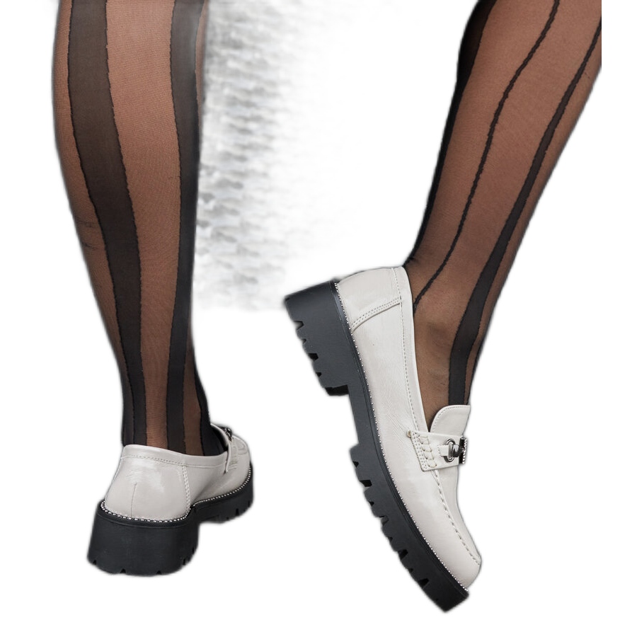Stylish, low loafers inserted in L. Grey, which combine comfort with a subtle glow. Made of ecological leather with a varnished finish, with decorative zircons, they are perfect for both casual and more formal stylizations. The natural leather insole provides wearing comfort, and a rubber, black sole guarantees grip and durability.