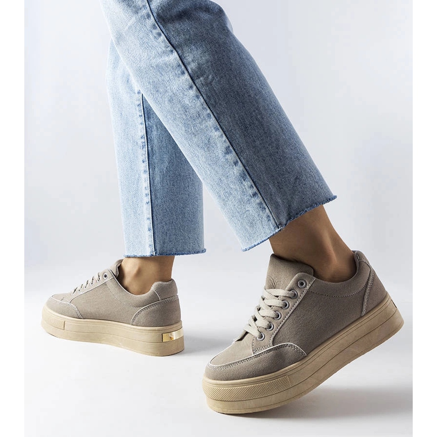 Modern, universal amathymes sneakers in a fashionable, gray color - perfect every day and for light, summer stylizations. Made of ecological leather, with a beige rubber sole and a comfortable fabric insert. A lace model with a round toe, without designs - a simple, elegant cut that matches many occasions.