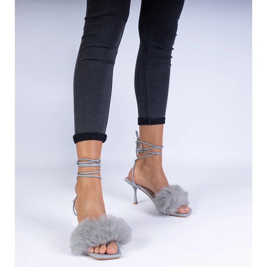 Details: Gray sandals on a heel with fur grey
