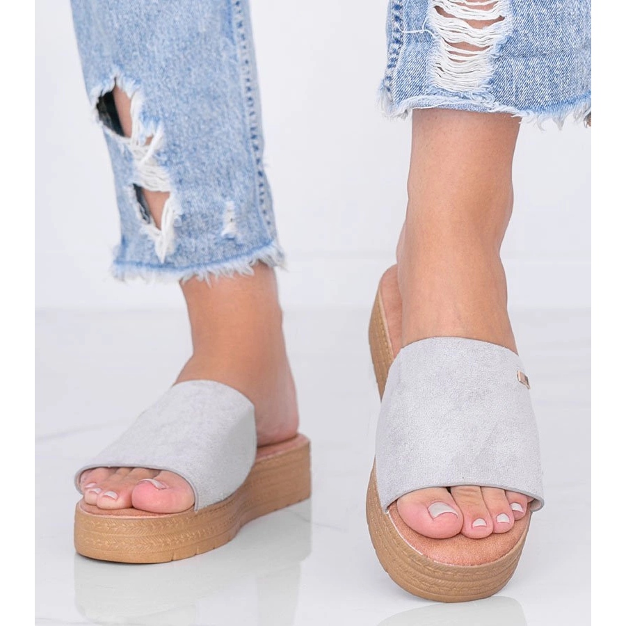 Fashionable women's slippers with a casual character - ideal for everyday stylizations. They have a thick, 3.5 cm platform that gives a modern look and ensures stability. The upper made of suede ecological leather, a soft Eco-leather insert guarantees comfort throughout the day. The beige plastic sole contrasts well with the gray upper. Round toe, without a pattern - universal and easy to combine with many wardrobe items.