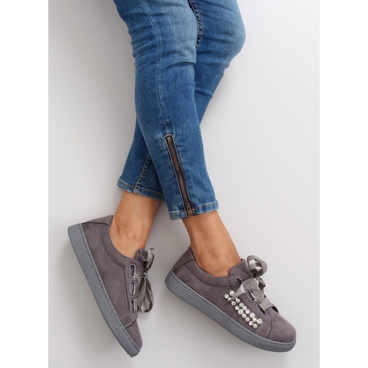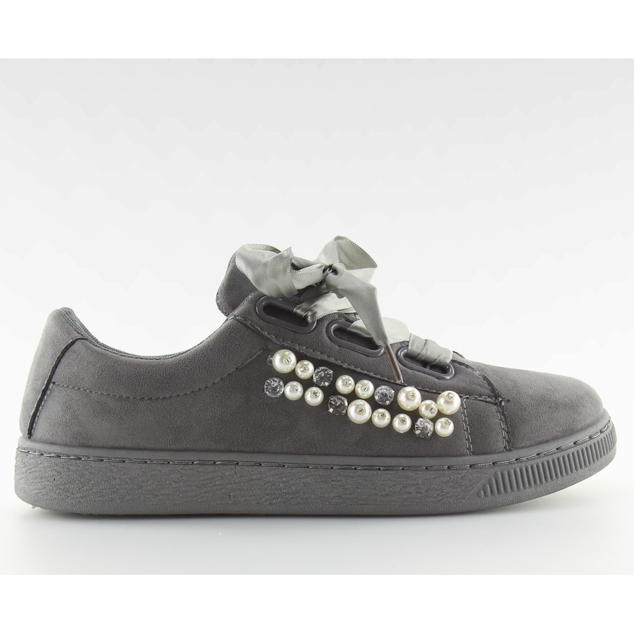 Sneakers With Pearls Gray H99-11 Gray are unique women's footwear that perfectly combines fashionable design with comfort of wearing. They are distinguished by a delicate decoration that gives them a romantic character - instead of traditional laces, an elegant satin ribbon was used, which fits into the latest trends of the season.