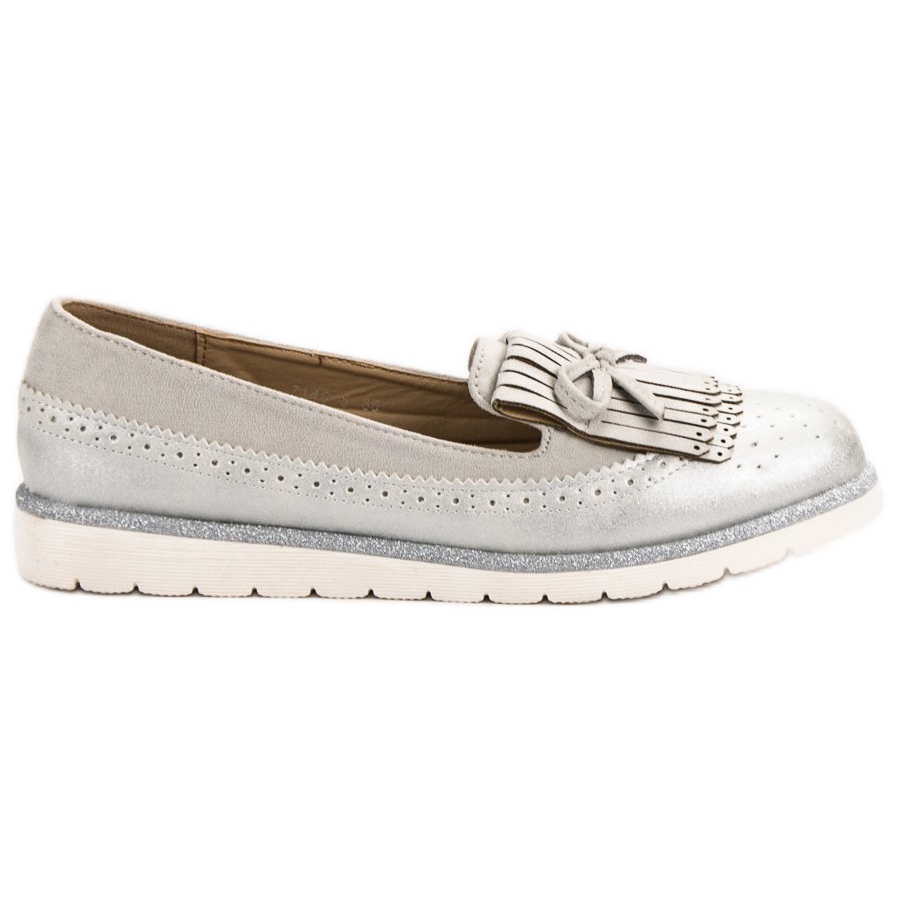 Balada Grey Women's Moccasins are a proposition for women who want to add a bit of uniqueness to their everyday style. These elegant shoes, made of high-quality ecological leather, combine modernity and classic, creating a unique design. Shades of grey, silver and white attract attention, and subtle details in the form of fringes and a bow give them a girlish charm.