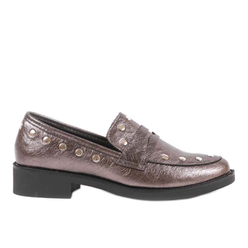 We present gray women's shoes C18-6297, which combine elegance and comfort. These slip-on shoes, made of high-quality leather-like material, perfectly fit into current fashion trends. Decorative metal round inserts give them originality and subtle shine, thanks to which they will be a perfect complement to many styles.