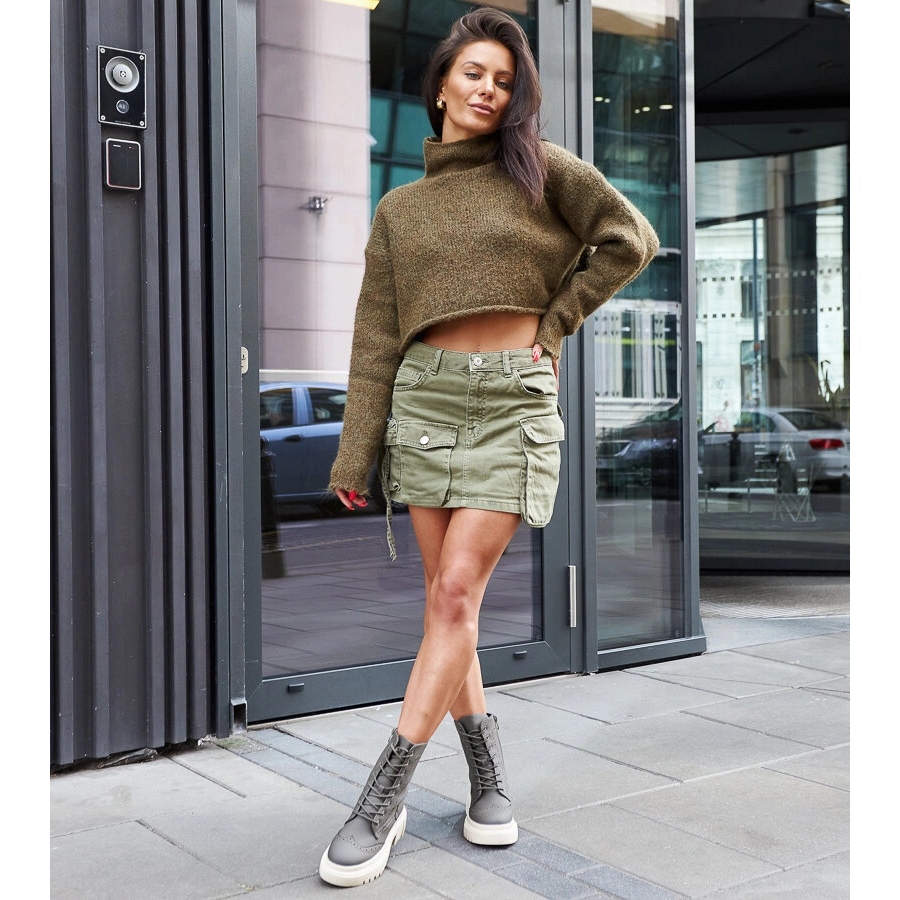 Green boots decorated with Nicla stitching (JJ12P model) - modern, comfortable and stylish shoes for women who are looking for a city look with a hint of severity. Made of high quality ecological leather, in an intense shade of Green, they are distinguished by decorative stitching and a round toe that emphasizes their character. The castle makes it easier to put on, and lacing allows you to match the shoe to the foot - perfect for everyday stylizations in the autumn -winter season.