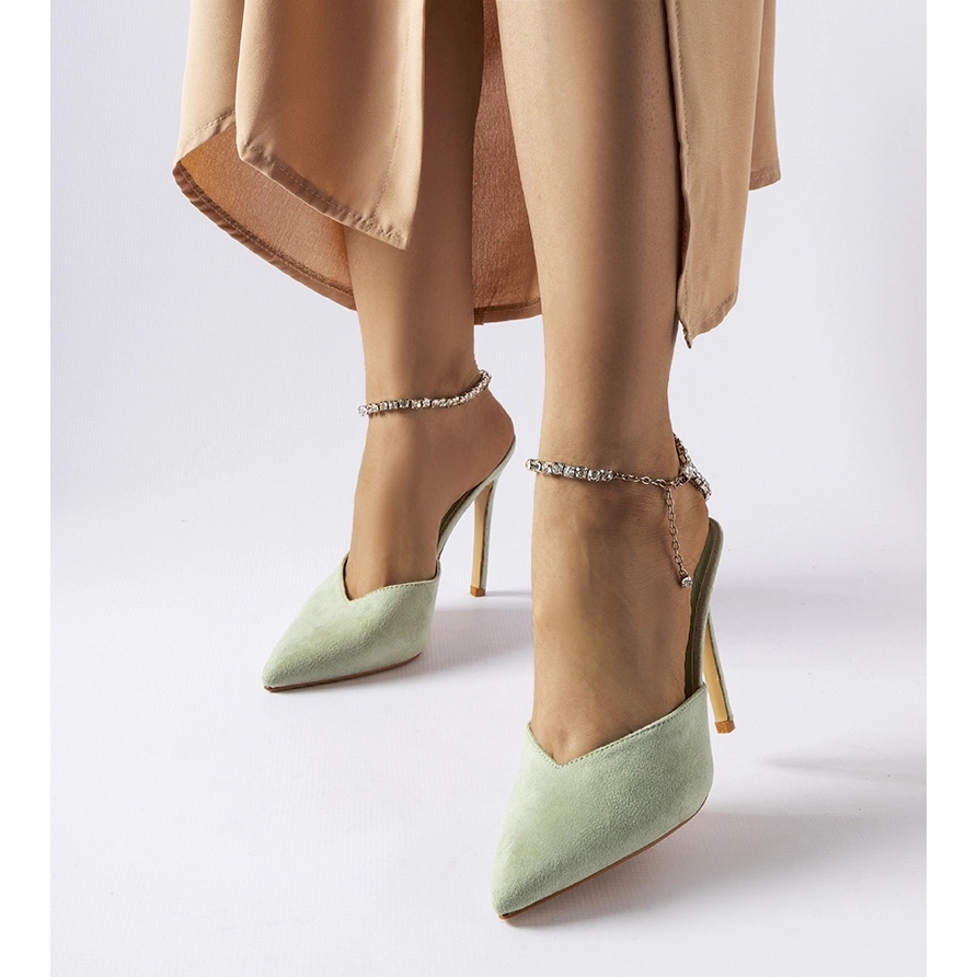 The phenomenal Claude green flip flops are a combination of female subtlety and expressive character. Made of suede ecological leather, decorated with shiny zircons, on a slim 11 cm pin. Perfect for summer parties, evening outings and unique occasions.