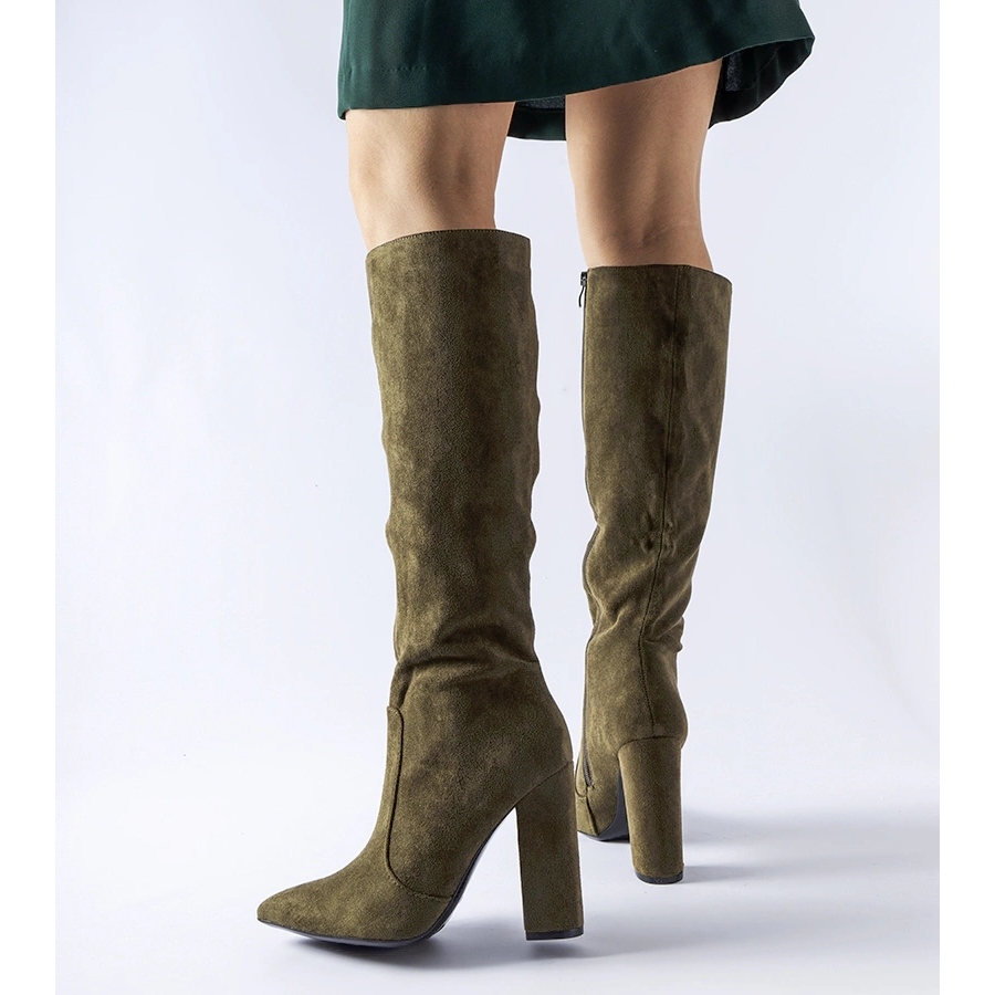 Discover the magic in fashion with the green Cinq-Mars block heel boots, which are the perfect combination of elegance and modernity. Made of high-quality eco-suede leather, these boots not only impress with their unique color, but also provide comfort. The knee-high height and pointed toe attract attention and add a stylish character to the whole.
