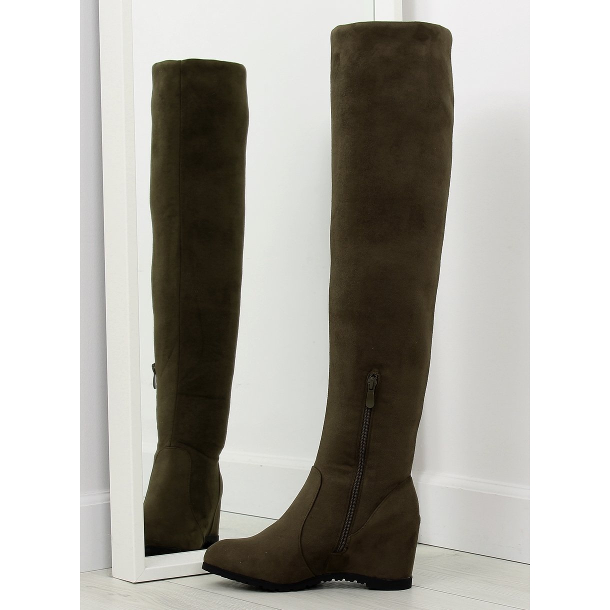 The upper reaching below the knee and the 7 cm high wedge add elegance to any styling, and their smooth texture means you can easily match them to various outfits. An additional advantage is the zipper placed on the side, which makes it easy to put on and take off the shoes.